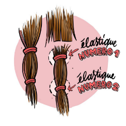 Vos cheveux seront séparés en deux. L'élastique n°1 est placé à la longueur de coupe souhaitée ; le 2e au-dessus des fourches. Nous couperons au-dessus du 1er élastique.